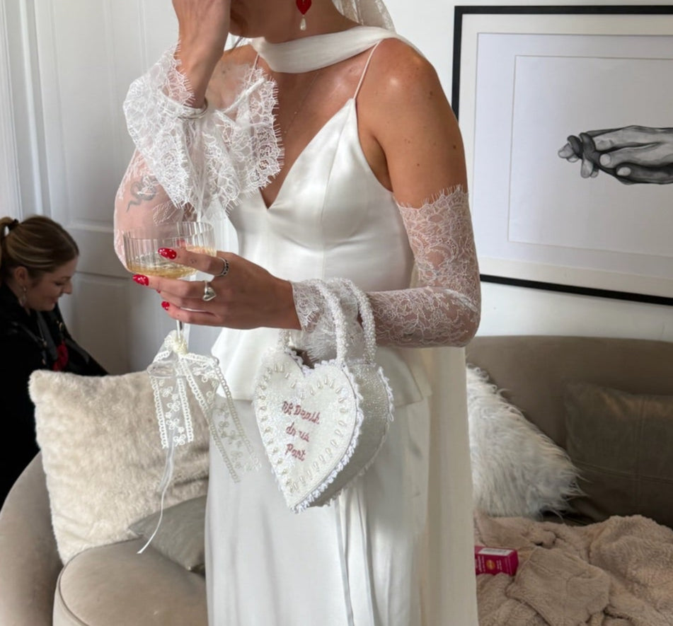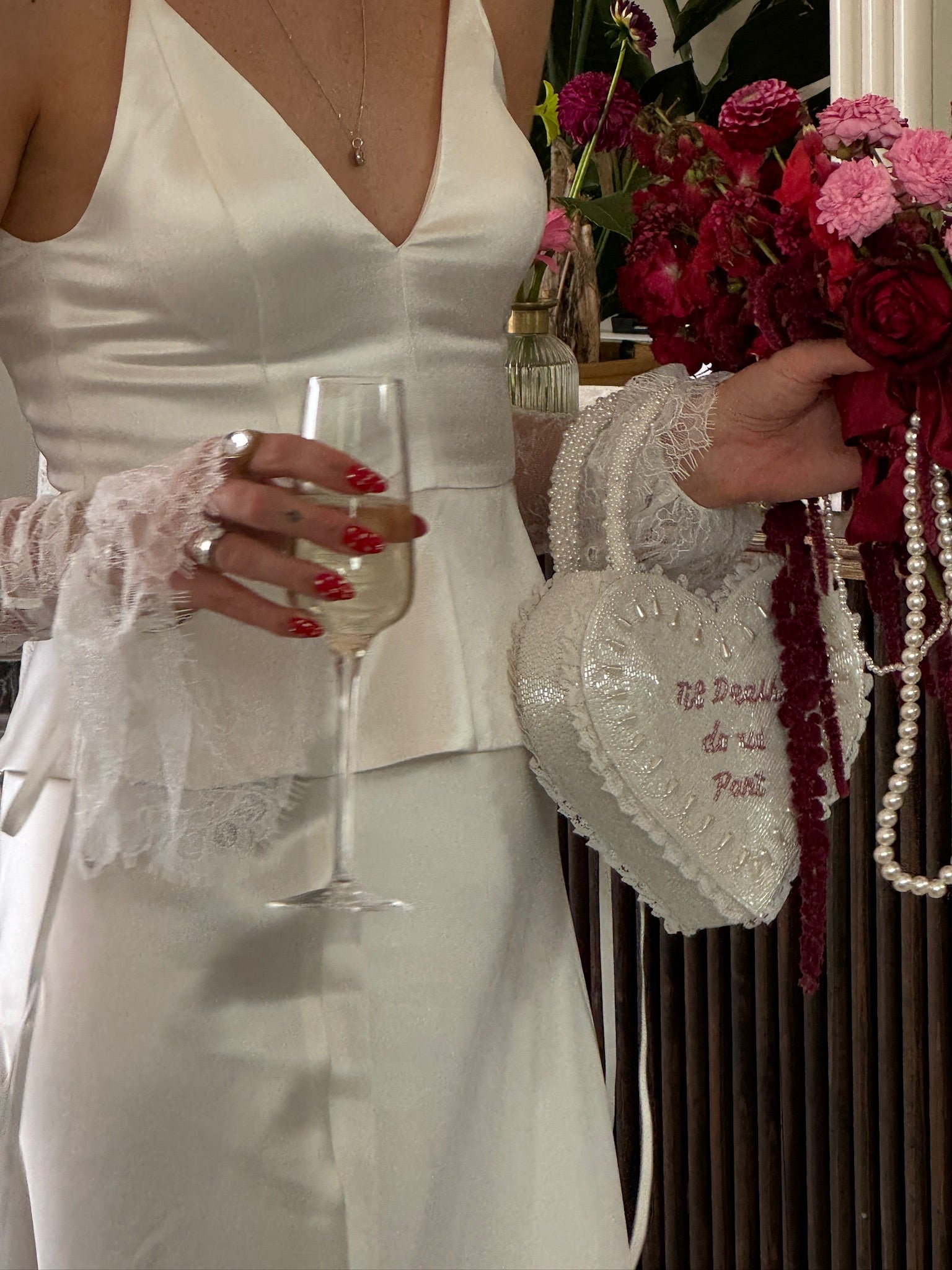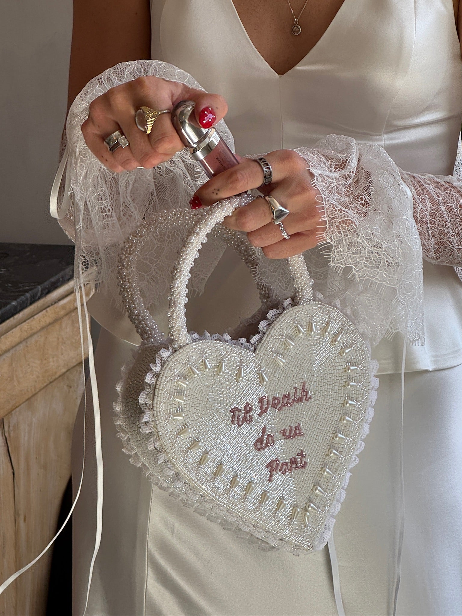 A love letter to cool brides everywhere. This Clio Peppiatt beaded heart bag is intricately hand-embellished with pearls, crystals, and a stitched “’Til Death Do Us Part” slogan — bold, romantic, and anything but traditional.